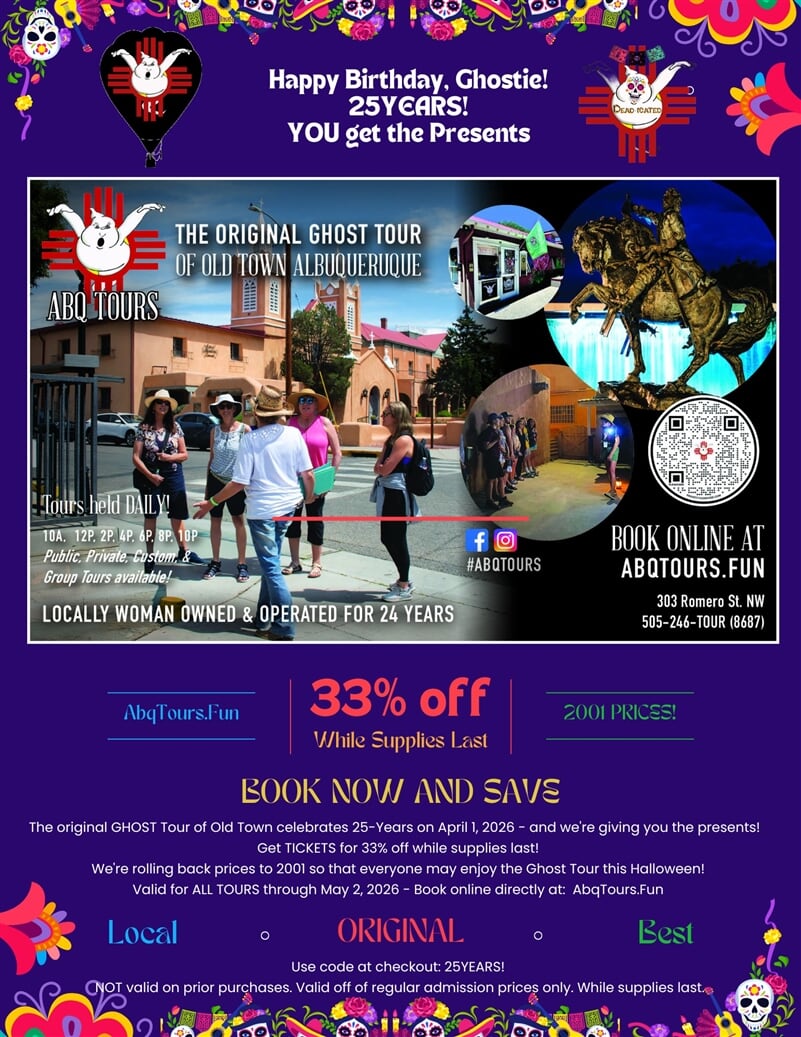 For almost 25 years, we've been Albuquerque's original ghost tour of Old Town, and we couldn't have done it without you! To say thanks, we're inviting you to celebrate with us. Now through October 31st, you can get a special discount of 33.33% off regular admission, paying the same price as our guests did back in 2001.